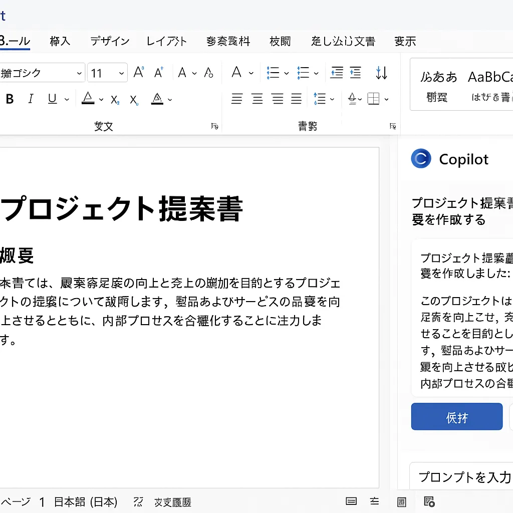 WordではCopilotが文章作成の頼もしい相棒になります。例えば、提案書や報告書のドラフトをゼロから作るのは骨の折れる作業ですが、Copilotにトピックや箇条書きのポイントを伝えるだけであっという間に最初の下書きが生成されます。白紙のページに悩むことがなくなり、すぐに書き始められるのは心強いですよね。