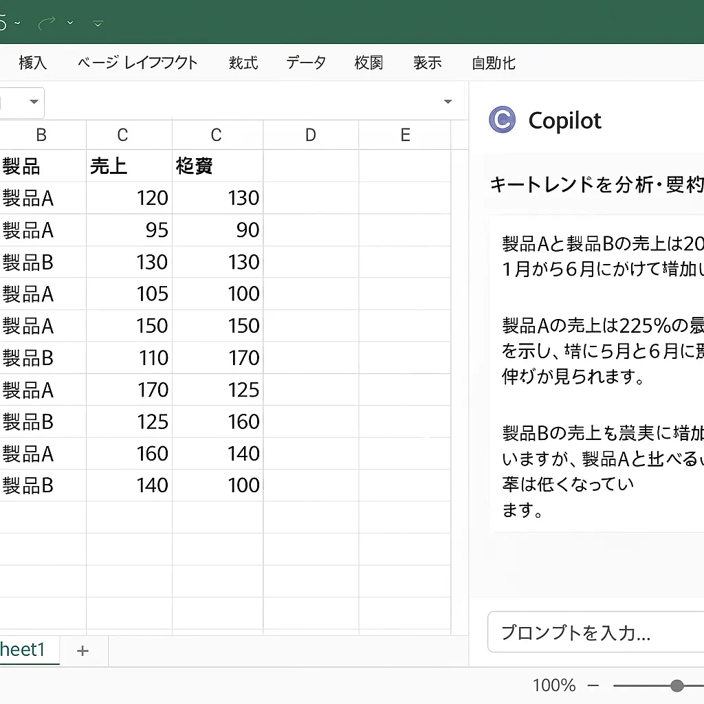 大量の売上データの中から売れ筋商品や季節変動の傾向を掴みたいとき、Copilotに聞けば重要なポイントを自動でまとめてレポートしてくれます。さらに「このデータでグラフを作って」と依頼すれば、適切なグラフ種別を選んで見やすいチャートを作成。データ整理や分析の下準備にかかる時間を大幅カットできるのが魅力です。