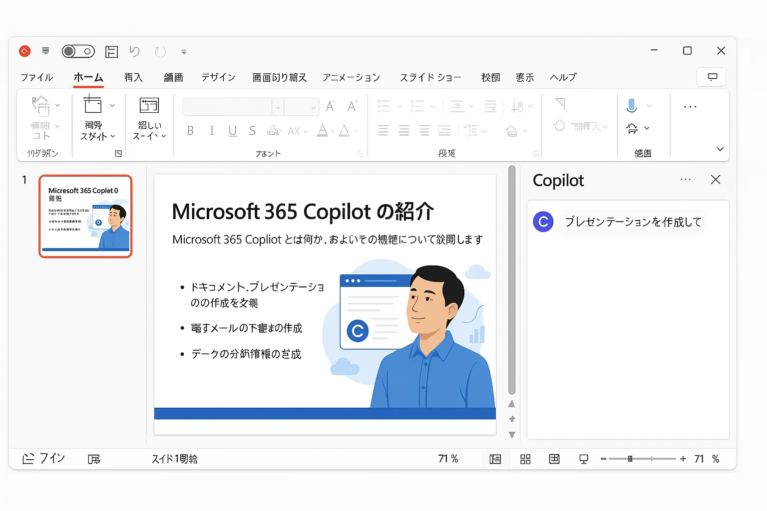PowerPointでもCopilotは資料作りの心強い味方です。伝えたい内容のポイントを指示すれば、美しいプレゼンテーションを数分で作成してくれます。例えば「このWordのレポートをもとに5枚のスライドを作って」と依頼すれば、文書から要点を抽出して指定枚数のスライドを自動作成。しかも内容に合った画像やイラスト、レイアウト、アニメーションまで含めて、発表できる状態のスライドに仕上げてくれるのです。細かなデザインを考える手間が省け、必要に応じて**「レイアウトをモダンな感じに変えて」**などとチャットで修正を指示することもできます。