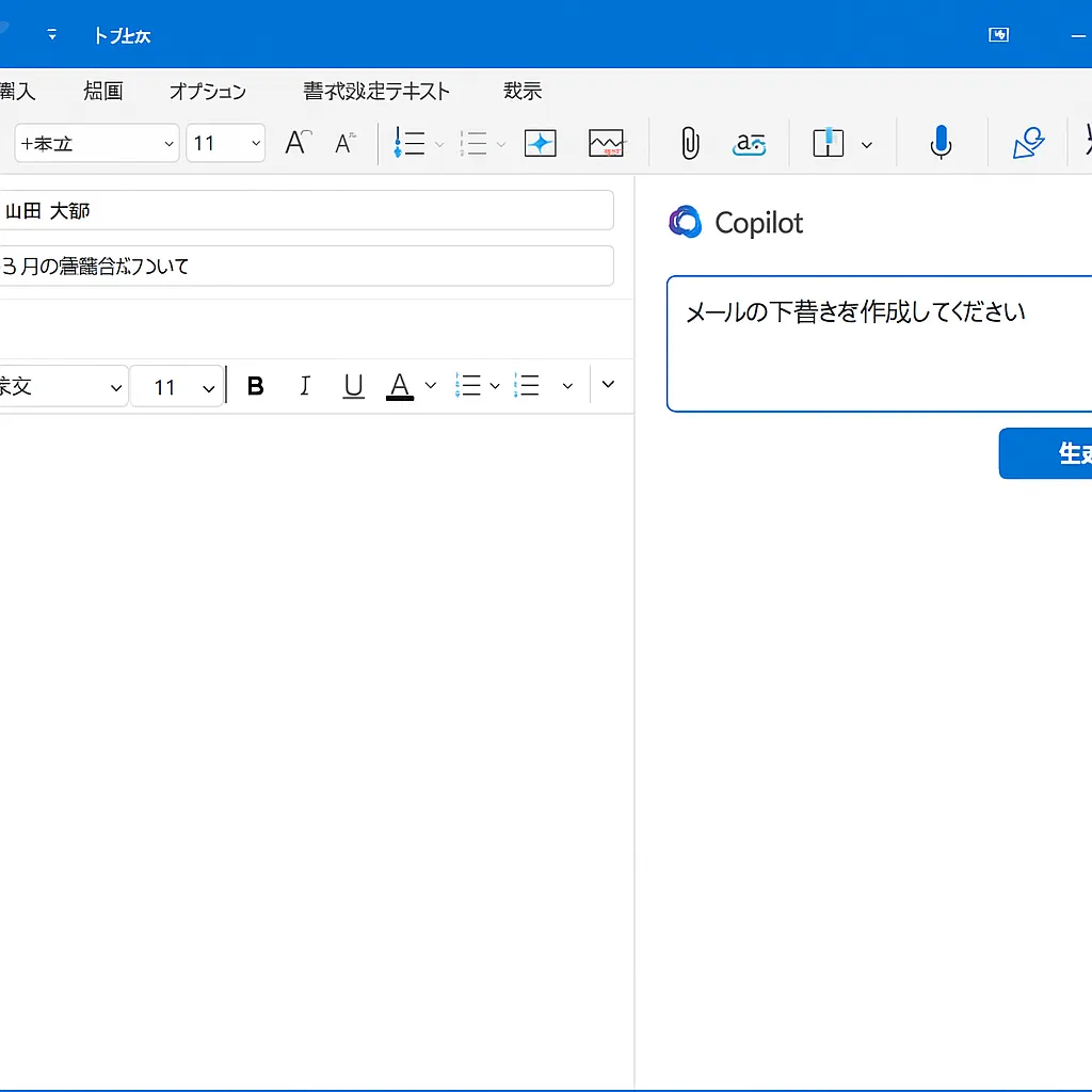 そして何と言っても便利なのがメールの下書き作成支援です。例えば「〇〇さんに、先週の会議資料を送る旨の丁寧な返信メールを書いて」と指示すれば、適切な件名やあいさつ文から始まる返信メールのドラフトを作ってくれます。表現が硬すぎたりカジュアルすぎたりする場合も、「もう少しフランクに」や「敬意を込めた表現にして」とお願いして文章トーンを調整可能です。Copilotのおかげで、一通一通ゼロから考える時間が減り、受信トレイの処理は数時間かかっていた作業が数分で完了することも夢ではありません。