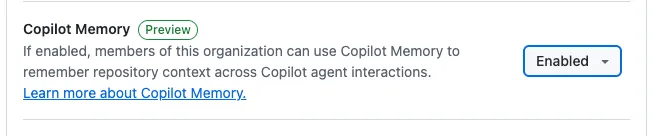 個人利用(Copilot Pro / Pro+)の場合は、GitHubのCopilot settingsからFeatures配下にあるCopilot MemoryをEnabledにします。組織利用(Business / Enterprise)の場合は、Organization settingsやEnterpriseのAI controlsでCopilot Memoryを許可する必要があります。