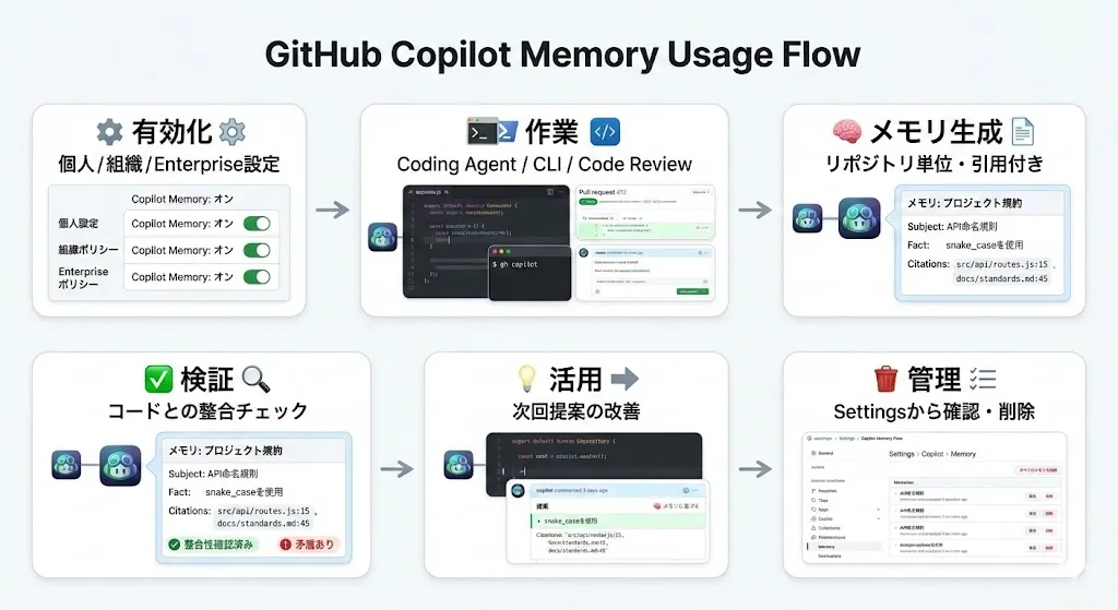 メモリが作成される条件は比較的明確です。Copilot Memoryが有効であり、そのリポジトリに対して書き込み権限を持つユーザーがCopilotを使って作業した場合にのみ生成されます。読み取り権限のみのユーザーは、既存メモリの恩恵は受けられますが、新たなメモリは作成されません。