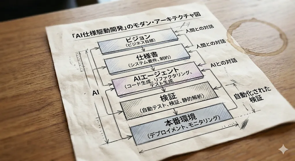 AIは仕様からコードを生成します。テストや検証システムは、そのコードが仕様を満たしているかを確認します。開発の中心はコードではなく仕様になります。
