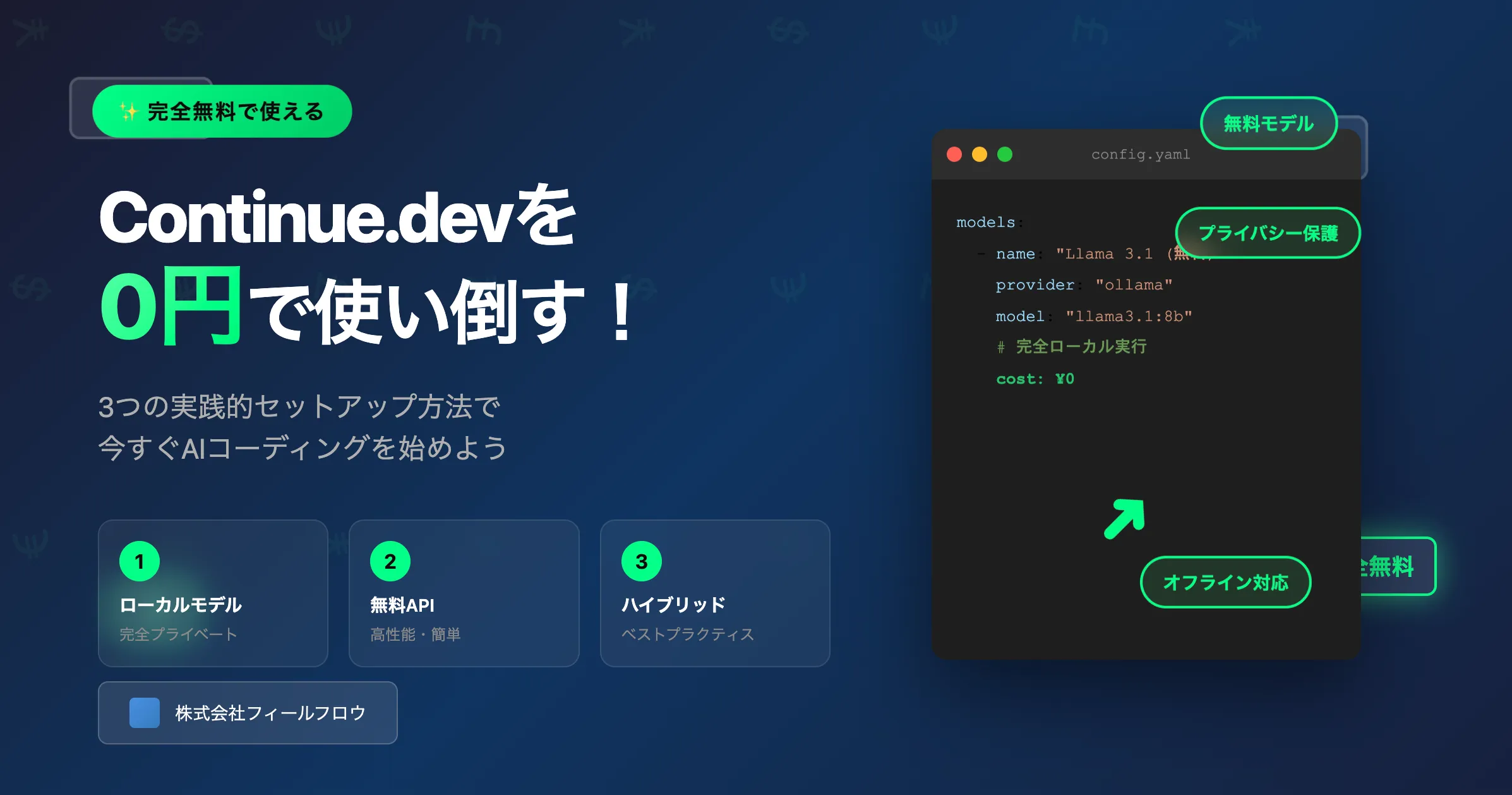 2025年6月5日 by AI侍 【完全無料】Continue.devを0円で使い倒す!3つの実践的セットアップ方法 はじめに:AIコーディングアシスタントを無料で使いたい全ての開発者へ GitHub Copilotの月額$10、年間で$120の出費。個人開発者や学習中のエンジニアにとって、この金額は決して小さくありません。しかし、AI … continue 無課金 生成AI